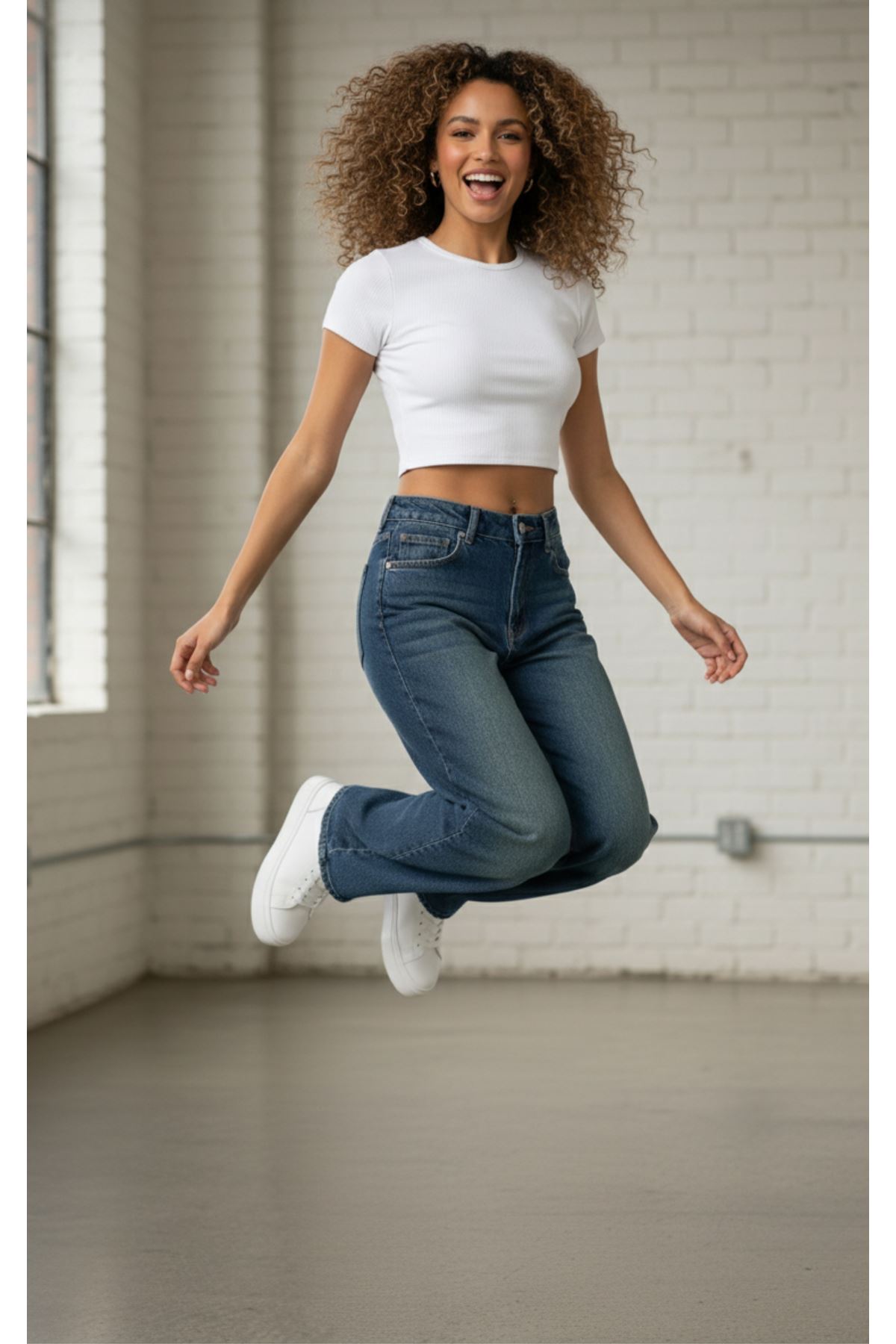 Stüdyo çekim kalitesindeki görünümüyle gardırobunuzun en kurtarıcı parçalarından biri olacak. Beyaz tişört, crop üst, sneaker veya topuklu tüm parçalarla kusursuz uyum sağlar.