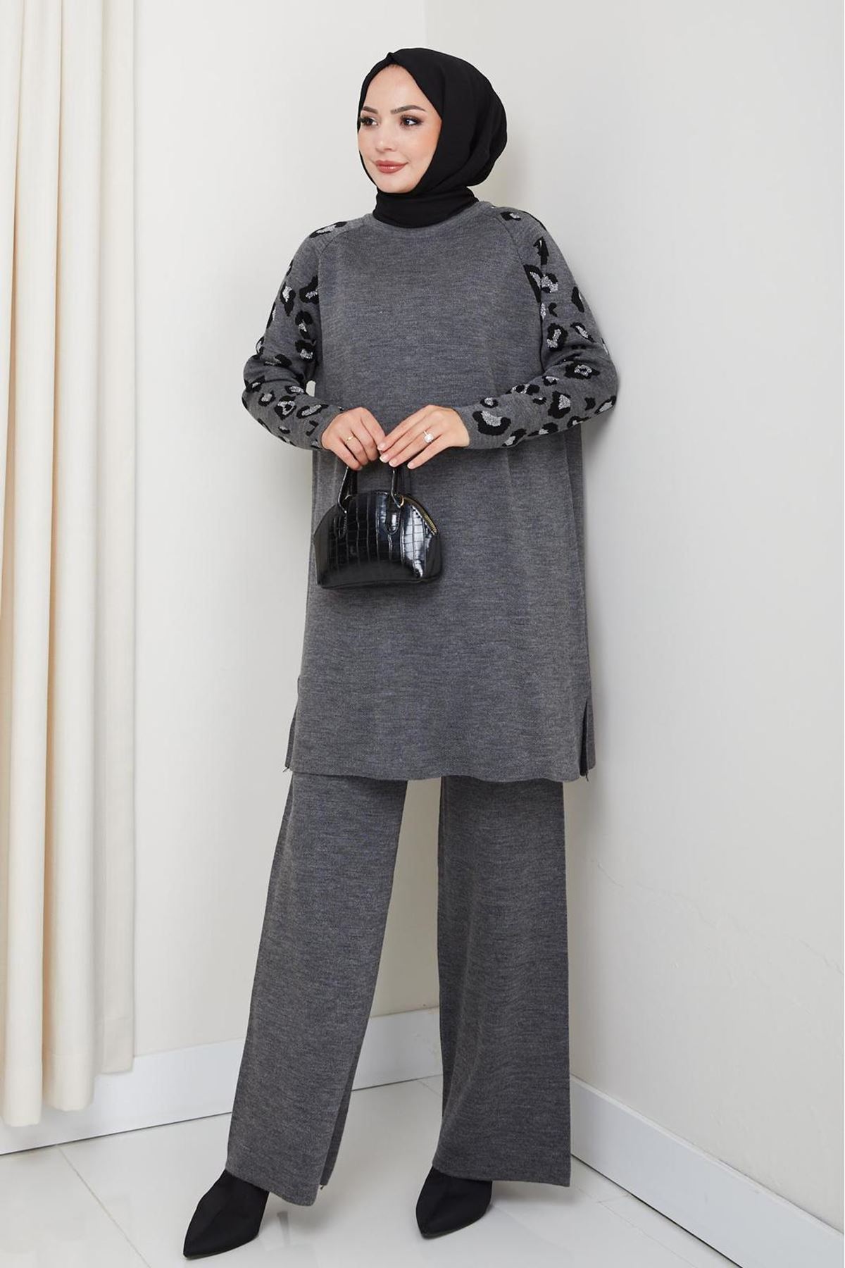 Leopar Desenli Kol Detaylı Triko Takım – Gri
