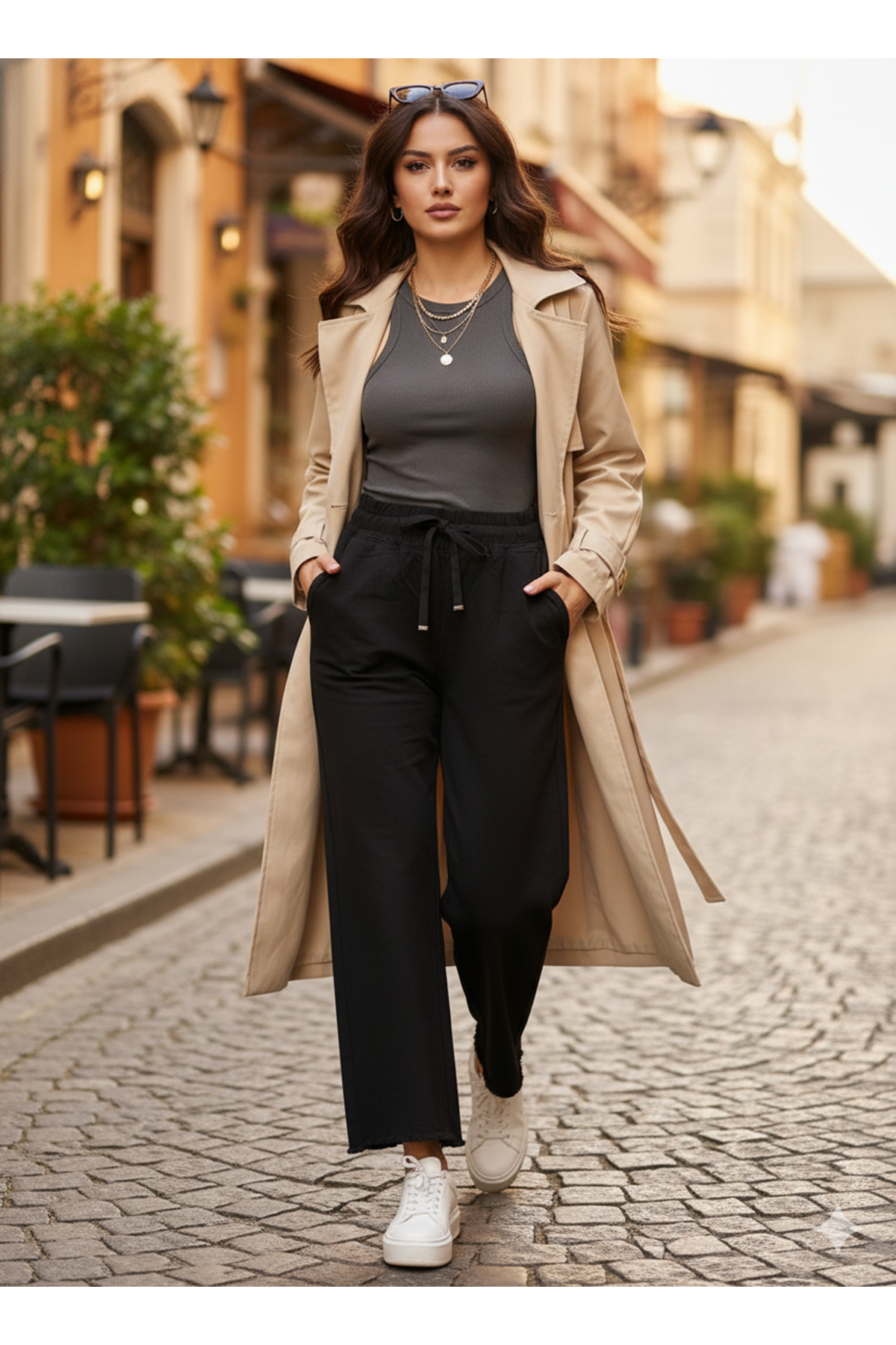 Konfor ve zarafeti bir araya getiren basic tarz! Yüksek bel, lastikli bel yapısı ve doğal dokusuyla bu pantolon, günlük kombinlerde şıklığı ve rahatlığı bir arada sunar. Hafif dökümlü formu ile her mevsim tercih edilebilir.