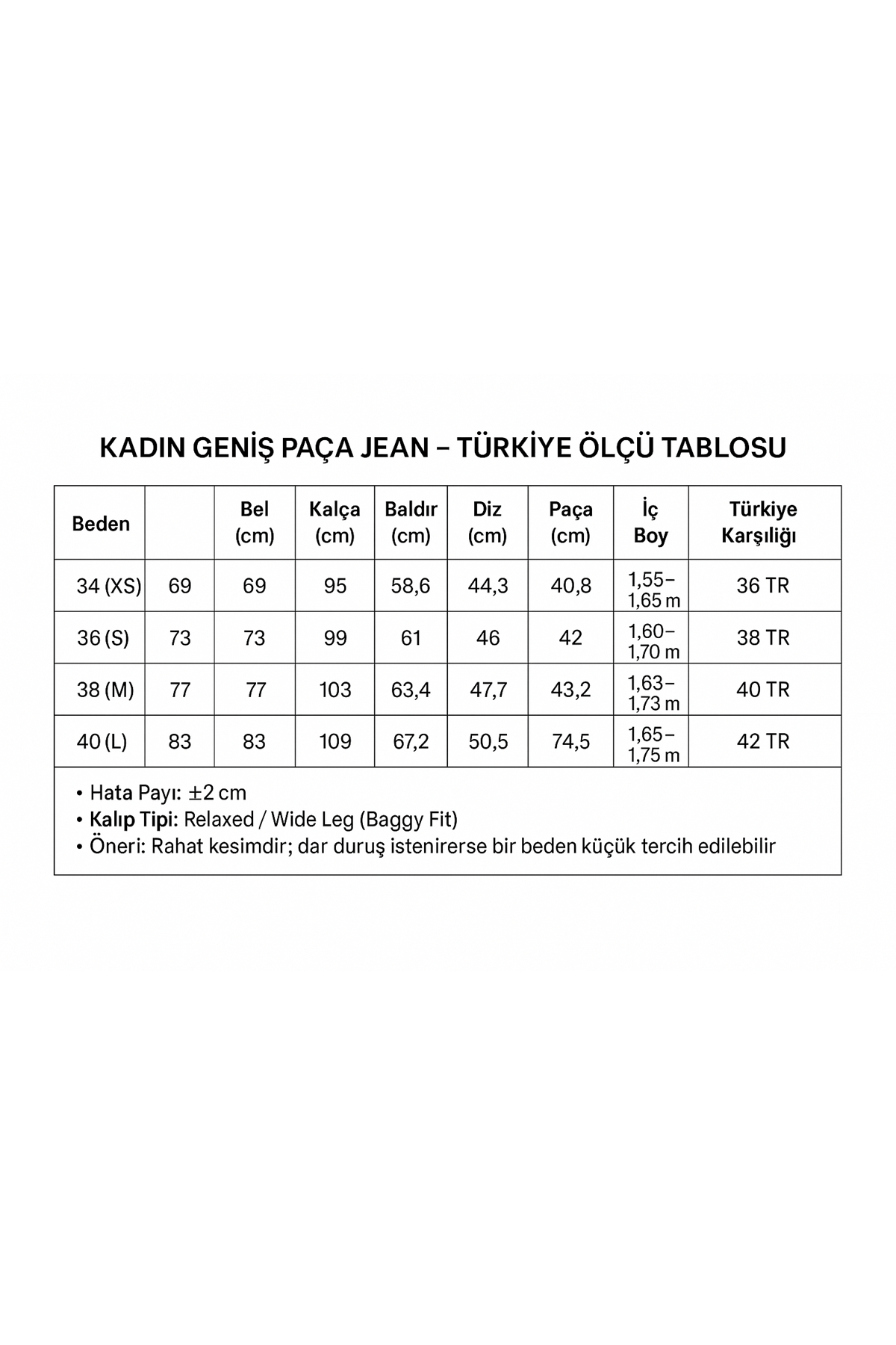 Günün her anında rahatlığı ve tarzı bir arada yaşa! Bu geniş paça kadın jean pantolon, yüksek belli kesimiyle vücudu zarifçe kavrarken, bol paça formuyla modern bir görünüm kazandırır. Yumuşak dokulu denim kumaşı sayesinde hem konforlu hem dayanıklıdır. Sneaker, crop top veya basic tişörtlerle kolayca kombinlenebilir.